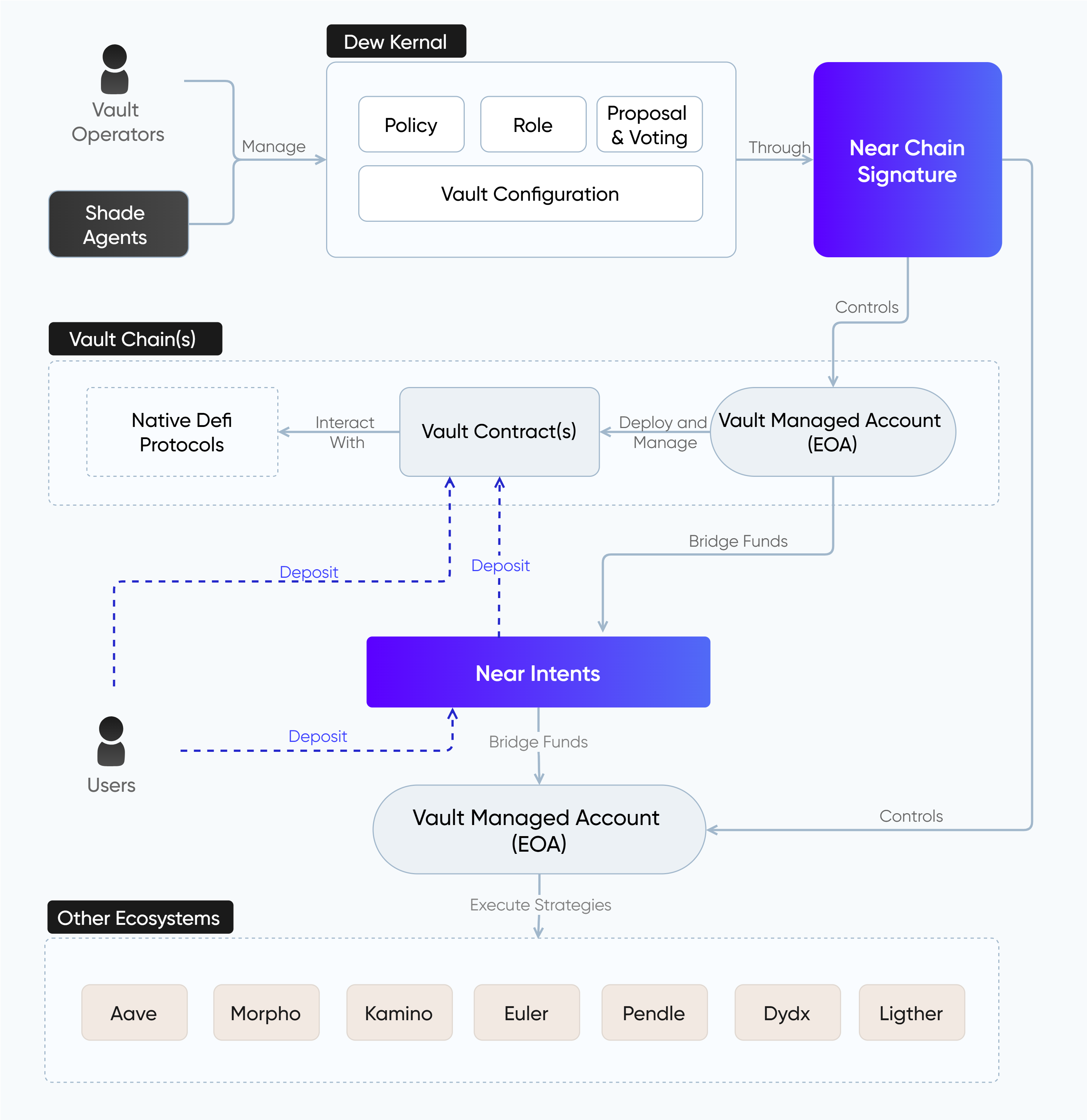 - Allows external accounts from other chains to authenticate and interact directly with Near-Deployed Vaults or Dew Kernel.